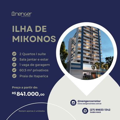 A linda Ilha de Mykonos, na Grécia, representa um perfeito exemplo de vida cheio de estilo à beira-mar. Uma forma de viver em contato com o mar e sua energia revigorante. A construtora, inspirada nesse estilo de vida, traz para você um empreendimento completo, combinando comodidade, lazer e uma excelente localização. São opções diferenciadas de apartamentos que se adequam perfeitamente ao seu estilo de vida! Seja bem-vindo ao ILHA DE MYKONOS. Venha viver o seu estilo na Praia de Itaparica. Destaques do imóvel: - 2 quartos com suíte e 60,5 m² privativos - Sala de estar e jantar - Banheiro social - Varanda - Cozinha com área de serviço - 1 vaga de garagem - Piso em porcelanato e laminado, rebaixamento em gesso, fechadura eletrônica, preparação para ar-condicionado split, preparação para aquecedor de passagem (gás) para fogão e chuveiros, duto para instalação de coifa e preparação para varanda gourmet (água, esgoto e energia). Infraestrutura do condomínio: - O empreendimento conta com guarda entregas, home office, beach point, pet point, bike sharing, minimercado e estação de recarga para carros elétricos. Elevadores, acesso para PCD, sistema de segurança 24 horas, portaria e câmeras, garantindo a tranquilidade e a privacidade dos moradores. - Lazer no pilotis com espaço funcional, play kids, fitness, salão de festas, miniquadra e banheiros. Na cobertura com piscinas adulto e infantil, sauna, churrasqueira, espaço gourmet, brinquedoteca e banheiros. Valor a partir de: R$ 841.703,00 (referente a unidade 1408 de 60,5m²) Sinal de R$183.546,00 + Parcela única de R$67.757,00 + Financiamento R$590.400,00 Valor poderá ser alterado a qualquer tempo, sem aviso prévio. Entre em contato e agende sua visita ao decorado, aproveita e segue meu Instagram! - NENGER LIMA - (27) 99833-1342 - CRECI-ES: 12683/F - @nenger.corretor - www.nengercorretor.com.br