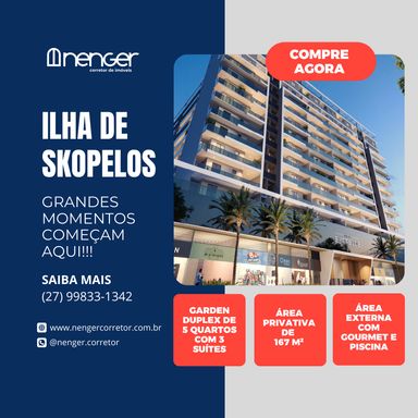 ILHA DE SKOPELOS, grandes momentos começam aqui. Um novo conceito de viver bem na Praia de Itaparica, a região que mais cresce e valoriza em Vila Velha. Com uma localização privilegiada, a poucos passos do mar e próximo a tudo o que você precisa, o ILHA DE SKOPELOS oferece plantas versáteis para diferentes estilos de vida, planejadas para proporcionar o máximo de conforto e bem-estar. Aqui, viver bem significa estar no lugar certo, com a tranquilidade de quem sabe que fez a escolha certa. Viva com estilo, curta a proximidade do mar e tenha a praticidade que o seu dia a dia exige. Tipologia: - Cobertura duplex com 3 quartos sendo 2 suítes - 115,12 m² ou 125,21 m² de área privativa - Hall privativo - Sala conjugada de estar e jantar, pé direito duplo - Varanda - Lavabo - Cozinha com área de serviço - Andar superior com sala, banheiro social, área externa descoberta com gourmet e piscina de aproximadamente (3,00x2,00)m - 2 vagas de garagem - Piso em porcelanato e laminado, rebaixamento em gesso, preparação para ar-condicionado split, preparação para aquecedor de passagem (gás) para fogão e chuveiros, duto para instalação de coifa e preparação para varanda gourmet (água, esgoto e energia). Infraestrutura do condomínio: - O empreendimento conta com port-cochère, guarda entregas, espaço bealty, coworking, beach point, pet point, bike sharing, garagem box e minimercado. Elevadores, acesso para PCD, sistema de segurança 24 horas, portaria e câmeras, garantindo a tranquilidade e a privacidade dos moradores. - Lazer no pilotis com piscina adulto com raia, piscina infantil, prainha, deck/solarium, spa, espaço zen, fitness, quadra recreativa, espaço família, churrasqueira gourmet, pátio kids, churrasqueira sporte e banheiros. No mezanino salão gourmet/confraria do vinho, salão de festas, brinquedoteca, pub/jogos e banheiros. - Condições especiais de LANÇAMENTO. Valor a partir de: R$ 2.459.426,00 (referente a unidade 1203A com 115,12 m² privativos) Valor poderá ser alterado a qualquer tempo, sem aviso prévio. Entrega prevista para primeiro semestre de 2030. Entre em contato e garanta o seu. Aproveita e segue meu Instagram! - NENGER LIMA - (27) 99833-1342 - CRECI-ES: 12683/F - @nenger.corretor - www.nengercorretor.com.br