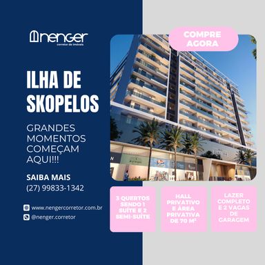 ILHA DE SKOPELOS, grandes momentos começam aqui. Um novo conceito de viver bem na Praia de Itaparica, a região que mais cresce e valoriza em Vila Velha. Com uma localização privilegiada, a poucos passos do mar e próximo a tudo o que você precisa, o ILHA DE SKOPELOS oferece plantas versáteis para diferentes estilos de vida, planejadas para proporcionar o máximo de conforto e bem-estar. Aqui, viver bem significa estar no lugar certo, com a tranquilidade de quem sabe que fez a escolha certa. Viva com estilo, curta a proximidade do mar e tenha a praticidade que o seu dia a dia exige. Tipologia: - 3 quartos, todos suítes (1 máster e 2 canadenses) - 70 m² de área privativa - Hall privativo - Sala conjugada de estar e jantar - Varanda - Lavabo - Cozinha com área de serviço - 2 vagas de garagem - Piso em porcelanato e laminado, rebaixamento em gesso, preparação para ar-condicionado split, preparação para aquecedor de passagem (gás) para fogão e chuveiros, duto para instalação de coifa e preparação para varanda gourmet (água, esgoto e energia). Infraestrutura do condomínio: - O empreendimento conta com port-cochère, guarda entregas, espaço bealty, coworking, beach point, pet point, bike sharing, garagem box e minimercado. Elevadores, acesso para PCD, sistema de segurança 24 horas, portaria e câmeras, garantindo a tranquilidade e a privacidade dos moradores. - Lazer no pilotis com piscina adulto com raia, piscina infantil, prainha, deck/solarium, spa, espaço zen, fitness, quadra recreativa, espaço família, churrasqueira gourmet, pátio kids, churrasqueira sporte e banheiros. No mezanino salão gourmet/confraria do vinho, salão de festas, brinquedoteca, pub/jogos e banheiros. - Condições especiais de LANÇAMENTO. Valor a partir de: R$ 965.200,00 (referente a unidade 407A) Valor poderá ser alterado a qualquer tempo, sem aviso prévio. Entrega prevista para primeiro semestre de 2030. Entre em contato e garanta o seu. Aproveita e segue meu Instagram! - NENGER LIMA - (27) 99833-1342 - CRECI-ES: 12683/F - @nenger.corretor - www.nengercorretor.com.br