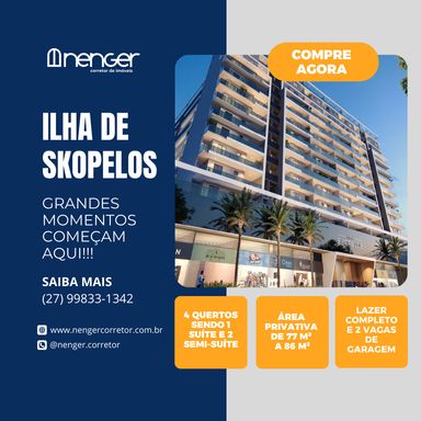 ILHA DE SKOPELOS, grandes momentos começam aqui. Um novo conceito de viver bem na Praia de Itaparica, a região que mais cresce e valoriza em Vila Velha. Com uma localização privilegiada, a poucos passos do mar e próximo a tudo o que você precisa, o ILHA DE SKOPELOS oferece plantas versáteis para diferentes estilos de vida, planejadas para proporcionar o máximo de conforto e bem-estar. Aqui, viver bem significa estar no lugar certo, com a tranquilidade de quem sabe que fez a escolha certa. Viva com estilo, curta a proximidade do mar e tenha a praticidade que o seu dia a dia exige. Tipologia: - 4 quartos com 3 suítes, sendo 2 canadenses - 76,85 m² a 85,75 m² de área privativa - Hall privativo - Sala conjugada de estar e jantar - Varanda - Lavabo/banheiro social - Cozinha com área de serviço - 2 vaga de garagem - Piso em porcelanato e laminado, rebaixamento em gesso, preparação para ar-condicionado split, preparação para aquecedor de passagem (gás) para fogão e chuveiros, duto para instalação de coifa e preparação para varanda gourmet (água, esgoto e energia). Infraestrutura do condomínio: - O empreendimento conta com port-cochère, guarda entregas, espaço bealty, coworking, beach point, pet point, bike sharing, garagem box e minimercado. Elevadores, acesso para PCD, sistema de segurança 24 horas, portaria e câmeras, garantindo a tranquilidade e a privacidade dos moradores. - Lazer no pilotis com piscina adulto com raia, piscina infantil, prainha, deck/solarium, spa, espaço zen, fitness, quadra recreativa, espaço família, churrasqueira gourmet, pátio kids, churrasqueira sporte e banheiros. No mezanino salão gourmet/confraria do vinho, salão de festas, brinquedoteca, pub/jogos e banheiros. - Condições especiais de LANÇAMENTO. Valor a partir de: R$ 1.298.212,00 (referente a unidade 401A) Valor poderá ser alterado a qualquer tempo, sem aviso prévio. Entrega prevista para primeiro semestre de 2030. Entre em contato e garanta o seu. Aproveita e segue meu Instagram! - NENGER LIMA - (27) 99833-1342 - CRECI-ES: 12683/F - @nenger.corretor - www.nengercorretor.com.br