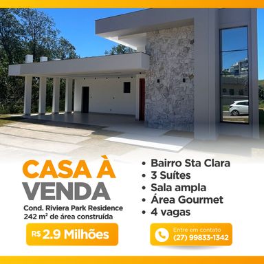 - RIVIERA PARK RESIDENCE, o mais exclusivo condomínio de alto padrão em Vila Velha- ES. Imagine só viver em um lugar que combina a serenidade do campo, as opções de lazer de um resort e a infraestrutura completa da cidade. Descrição do imóvel: -Casa Linear -Terreno de 570m² | Área construída: 242m² -Fachada imponente com volumes modernos e iluminação cênica -3 suítes amplas, sendo 1 master com closet e banheiro com cuba dupla, ducha dupla e banheira -Sala de estar e jantar com pé-direito elevado e integração com cozinha, gourmet e área externa -Cozinha com ilha central, bancadas em quartizito mont blanc -Acabamento em porcelanato Pérsia Grigio e louças Deca -Área gourmet completa com churrasqueira -Piscina com prainha e vista livre para área verde -Lavabo interno e externo -4 vagas de garagem, 2 cobertas e 2 descobertas Infraestrutura para energia solar e automação Imagens de marcenaria e itens decorativos meramente ilustrativas. Previsão de entrega: outubro de 2025 Infraestrutura do condomínio: - O empreendimento conta com sistema de segurança 24 horas, portaria e câmeras, garantindo a tranquilidade e a privacidade dos moradores. - No condomínio, você ainda encontra uma área de lazer completa. Spa com sauna, piscina aquecida, lago com trilha, ciclovia, pista de patins e skate, quadras de squash, tênis, poliesportiva e campo Society, bocha, espaço fitness indoor e outdoor, espaço gourmet, forno de pizza, churrasqueiras, PUB, salão de festas, playground e brinquedoteca. - Valor do investimento: R$ 2.900.000,00 - Imóvel com matrícula regularizada - Aceita financiamento bancário Não perca essa oportunidade e agende logo a sua visita. Aproveita e me segue no Instagram. - NENGER LIMA --(27) 99833-1342 - CRECI-ES: 12683/F - @nenger.corretor - www.nengercorretor.com.br