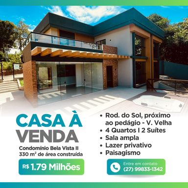 - Condomínio Bela Vista: O Refúgio Ideal para Sua Família A 25 minutos de Vila Velha, viva com mais espaço, tranquilidade e segurança! Harmonia com a natureza, conforto para sua vida. - Excelente casa duplex edificada em lote de 1.000m² Detalhes da Residência: - 1.000 m² terreno - 330 m² de área construída - A planta possui 4 quartos, sendo 2 suítes + home office! - Deck com Spa Hidromassagem - Paisagismo e jardinagem - Espaço Gourmet com churrasqueira, fogão a lenha, integrado a cozinha - Marcenaria nova na cozinha, gourmet e área de serviço com equipamentos novos! - Casa novíssima e de alto padrão! Condomínio fechado com total segurança e lazer completo, piscina adulto, piscina infantil, campo de futebol, quadra de beach tennis, playground, 2 churrasqueiras e campo de bocha. - Valor do investimento: R$ 1.790.000,00 - Possibilidade de permuta na Grande Vitória. - Agende uma visita e descubra o seu novo lar. Entre em contato agora mesmo. - NENGER LIMA - (27) 99833-1342 - CRECI-ES: 12683/F - @nenger.corretor