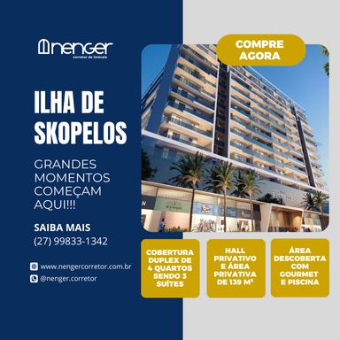 ILHA DE SKOPELOS, grandes momentos começam aqui. Um novo conceito de viver bem na Praia de Itaparica, a região que mais cresce e valoriza em Vila Velha. Com uma localização privilegiada, a poucos passos do mar e próximo a tudo o que você precisa, o ILHA DE SKOPELOS oferece plantas versáteis para diferentes estilos de vida, planejadas para proporcionar o máximo de conforto e bem-estar. Aqui, viver bem significa estar no lugar certo, com a tranquilidade de quem sabe que fez a escolha certa. Viva com estilo, curta a proximidade do mar e tenha a praticidade que o seu dia a dia exige. Tipologia: - Cobertura duplex com 4 quartos sendo 3 suítes (1 máster e 2 canadenses) - 138,86 m² de área privativa - Hall privativo - Sala conjugada de estar e jantar, pé direito duplo - Varanda - Lavabo/banheiro social - Cozinha com área de serviço - Andar superior com sala, banheiro social, área externa descoberta com gourmet e piscina de aproximadamente (3,00x2,00)m - 2 vagas de garagem - Piso em porcelanato e laminado, rebaixamento em gesso, preparação para ar-condicionado split, preparação para aquecedor de passagem (gás) para fogão e chuveiros, duto para instalação de coifa e preparação para varanda gourmet (água, esgoto e energia). Infraestrutura do condomínio: - O empreendimento conta com port-cochère, guarda entregas, espaço bealty, coworking, beach point, pet point, bike sharing, garagem box e minimercado. Elevadores, acesso para PCD, sistema de segurança 24 horas, portaria e câmeras, garantindo a tranquilidade e a privacidade dos moradores. - Lazer no pilotis com piscina adulto com raia, piscina infantil, prainha, deck/solarium, spa, espaço zen, fitness, quadra recreativa, espaço família, churrasqueira gourmet, pátio kids, churrasqueira sporte e banheiros. No mezanino salão gourmet/confraria do vinho, salão de festas, brinquedoteca, pub/jogos e banheiros. - Condições especiais de LANÇAMENTO. Valor a partir de: R$ 3.724.502,00 (referente a unidade 1201A) Valor poderá ser alterado a qualquer tempo, sem aviso prévio. Entrega prevista para primeiro semestre de 2030. Entre em contato e garanta o seu. Aproveita e segue meu Instagram! - NENGER LIMA - (27) 99833-1342 - CRECI-ES: 12683/F - @nenger.corretor - www.nengercorretor.com.br