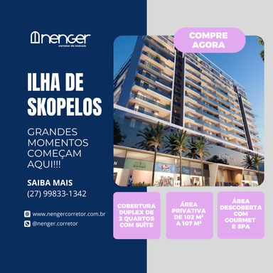 ILHA DE SKOPELOS, grandes momentos começam aqui. Um novo conceito de viver bem na Praia de Itaparica, a região que mais cresce e valoriza em Vila Velha. Com uma localização privilegiada, a poucos passos do mar e próximo a tudo o que você precisa, o ILHA DE SKOPELOS oferece plantas versáteis para diferentes estilos de vida, planejadas para proporcionar o máximo de conforto e bem-estar. Aqui, viver bem significa estar no lugar certo, com a tranquilidade de quem sabe que fez a escolha certa. Viva com estilo, curta a proximidade do mar e tenha a praticidade que o seu dia a dia exige. Tipologia: - Cobertura duplex com 3 quartos sendo 2 suítes - 115,12 m² ou 125,21 m² de área privativa - Hall privativo - Sala conjugada de estar e jantar, pé direito duplo - Varanda - Lavabo - Cozinha com área de serviço - Andar superior com sala, banheiro social, área externa descoberta com gourmet e piscina de aproximadamente (3,00x2,00)m - 2 vagas de garagem - Piso em porcelanato e laminado, rebaixamento em gesso, preparação para ar-condicionado split, preparação para aquecedor de passagem (gás) para fogão e chuveiros, duto para instalação de coifa e preparação para varanda gourmet (água, esgoto e energia). Infraestrutura do condomínio: - O empreendimento conta com port-cochère, guarda entregas, espaço bealty, coworking, beach point, pet point, bike sharing, garagem box e minimercado. Elevadores, acesso para PCD, sistema de segurança 24 horas, portaria e câmeras, garantindo a tranquilidade e a privacidade dos moradores. - Lazer no pilotis com piscina adulto com raia, piscina infantil, prainha, deck/solarium, spa, espaço zen, fitness, quadra recreativa, espaço família, churrasqueira gourmet, pátio kids, churrasqueira sporte e banheiros. No mezanino salão gourmet/confraria do vinho, salão de festas, brinquedoteca, pub/jogos e banheiros. - Condições especiais de LANÇAMENTO. Valor a partir de: R$ 2.459.426,00 (referente a unidade 1203A com 115,12 m² privativos) Valor poderá ser alterado a qualquer tempo, sem aviso prévio. Entrega prevista para primeiro semestre de 2030. Entre em contato e garanta o seu. Aproveita e segue meu Instagram! - NENGER LIMA - (27) 99833-1342 - CRECI-ES: 12683/F - @nenger.corretor - www.nengercorretor.com.br