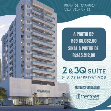 Pertinho de tudo que você precisa para viver com conforto, sem abrir mão do mar, da praia e da qualidade de vida . O Acqua Marina é um lugar especial e estrategicamente localizado próximo ao mar, onde você aproveita, além da praticidade das lojas de conveniência no próprio condomínio, a proximidade dos melhores restaurantes, padarias, bares, lojas, faculdades, hospitais, parques e muita gente bonita circulando. O condomínio oferece: Quadra recreativa, piscina, solarium, espaço grill, horta, sauna, salão de festas, bike point, beach point, coworking, entre outras áreas incríveis. Localização privilegiada, a três quadras da Praia de Itaparica, Vila Velha/ES. Obra a todo vapor e entrega programada para março de 2026. Investimento a partir de R$ 633.413,00 (referente a unidade 1307, 2 qts, 52m² e 1 vaga) tabela válida até 28/02/2026. Corra, está acabando, garanta logo o seu, fale comigo. NENGER LIMA (27) 99833-1342 CRECI-ES: 12683/F @nenger.corretor www.nengercorretor.com.br