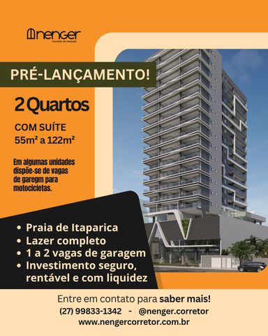 PARA MORAR, LOCAR E LUCRAR! O Itaparica Prime DR Residence é símbolo de consolidação, visão de futuro e protagonismo. Um projeto desenvolvido com atenção a cada detalhe, pensado para se destacar, entregar mais e surpreender. Idealizado para oferecer uma experiencia completa de satisfação aos moradores, investidores e usuários, com espaços bem planejados e infraestrutura completa. Com Qualidade de vida, mobilidade e segurança, oportunidades solida para investidores, tanto na valorização durante a obra quanto por meio de locação de curta ou longa temporada. 100% liberado desde a incorporação. Localizado em uma das regiões que mais valorizam em Vila Velha, a poucos passos do mar, com infraestrutura completa de comércios e serviços. Descrição do apartamento. - Unidades com 55,55 a 122,15m² de área privativa; - 2 quarto com suíte; - 2 banheiro; - Sala estar e jantar; - Varanda; - Cozinha com área de serviço; - 1 vaga de garagem; - Revestimento do piso em porcelanato na varanda, rebaixamento em gesso, linhas frigorígenas dos aparelhos de ar-condicionado já instaladas, infraestrutura para automação, fechadura eletrônica nas portas principais e tubulação metalizada sobre o gesso para coifa. Quartos com piso vinílico, cortineiros nas janelas, tomadas USB, portas de madeira ecológica com borrachas de vedação e muito mais. Banheiros com ventilação natural, ralo linear de inox e nicho na parte interna no box e água do chuveiro aquecida através de placas solares. Varanda gourmet com bancada, pontos de água, esgoto, elétrica, tomada USB, cuba e torneira em inox. Sobre o empreendimento: - O empreendimento conta com portaria equipada com sistema de reconhecimento facial, monitoramento por câmera e pulmão de segurança. Acesso para PCD, elevadores, guarda-volumes, delivery, lavanderia, coworking, bicicletário e minimercado. Hidrômetro, medidor de gás individual e infraestrutura para carregamento veicular. - Lazer completo no térreo, equipado e decorado. Com piscina adulto, piscina infantil, deck lazer, deck exclusivo, solarium, sauna integrada a piscina, fitness, baby play, playground, brinquedoteca, miniquadra de esportes, churrasqueiras, praça das mães, praça teen, pet place e salão gourmet. - Investimento a partir de: R$ 863,628,00 (unidade 607, apto de 2 quartos com suíte, 1 vaga e 55,55m² / preço válido até 30/11/2025). Início das obras em outubro de 2026 e entrega em outubro de 2030. Realize seu sonho e de sua família. Fale comigo agora e aproveite os preços e condições especiais de PRÉ-LANÇAMENTO! 👨💼 NENGER LIMA 📲 (27) 99833-1342 💳 CRECI-ES: 12683/F 📸 @nenger.corretor 🌍 www.nengercorretor.com.br