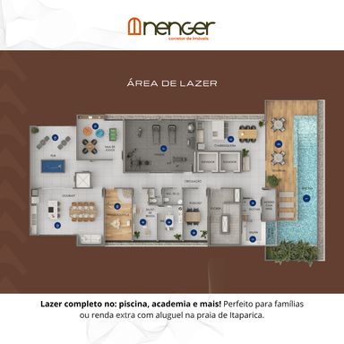 - Lazer completo, equipado e decorado. Com piscina adulto, piscina infantil, solarium, SPA, sauna, fitness, churrasqueiras, podcast, salão de beleza, brinquedoteca, pub, salão de jogos, espaço gourmet, quadra de esportes, playground e salão de festas.